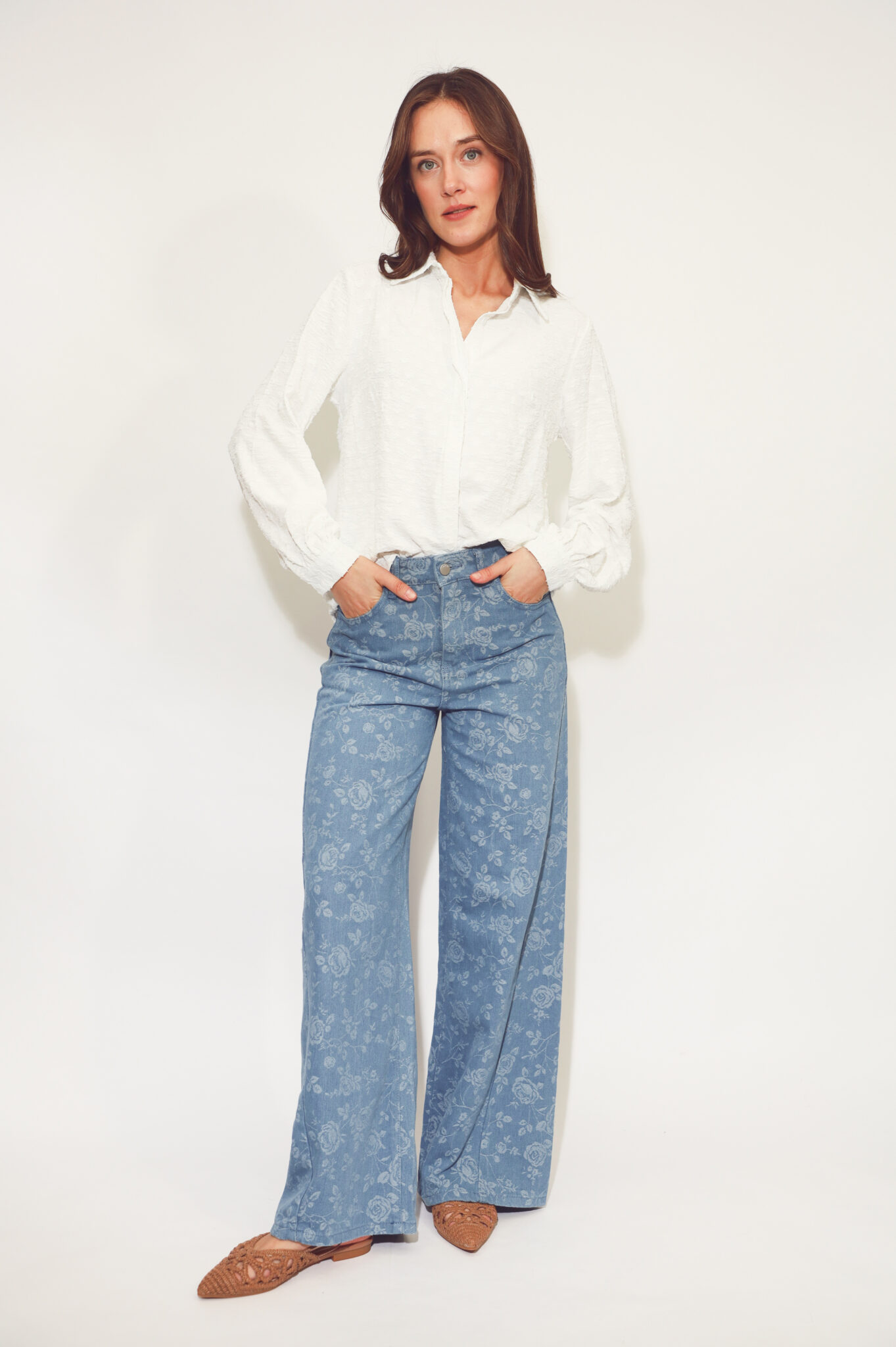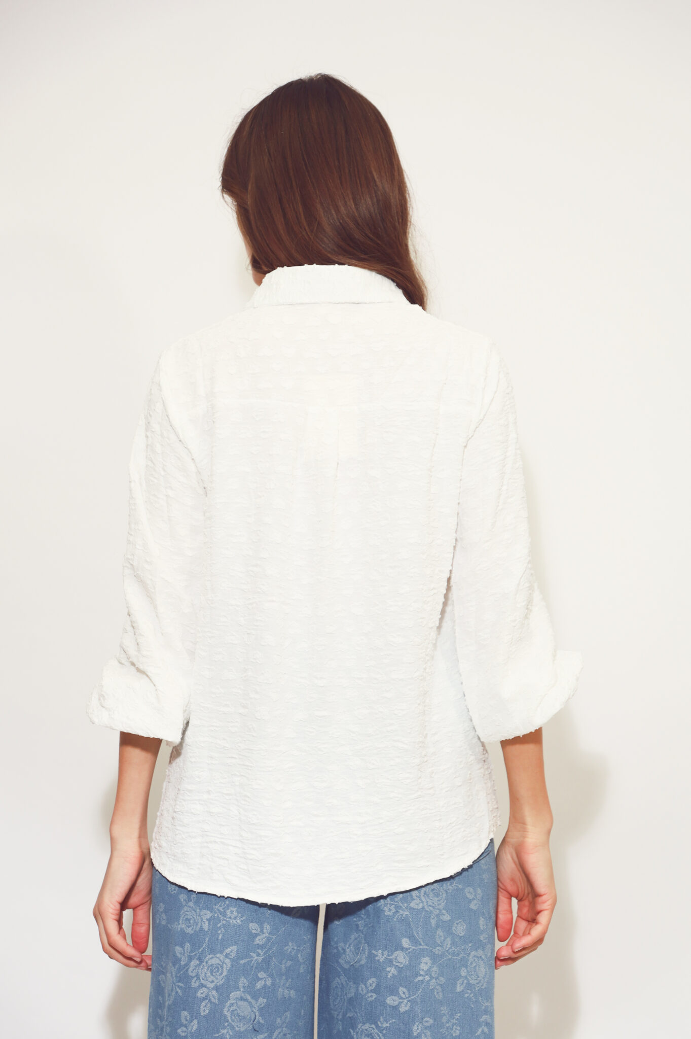 חולצה מכופתרת עם שרוולים תפוחים ודיטיילס הדפס רקמה.