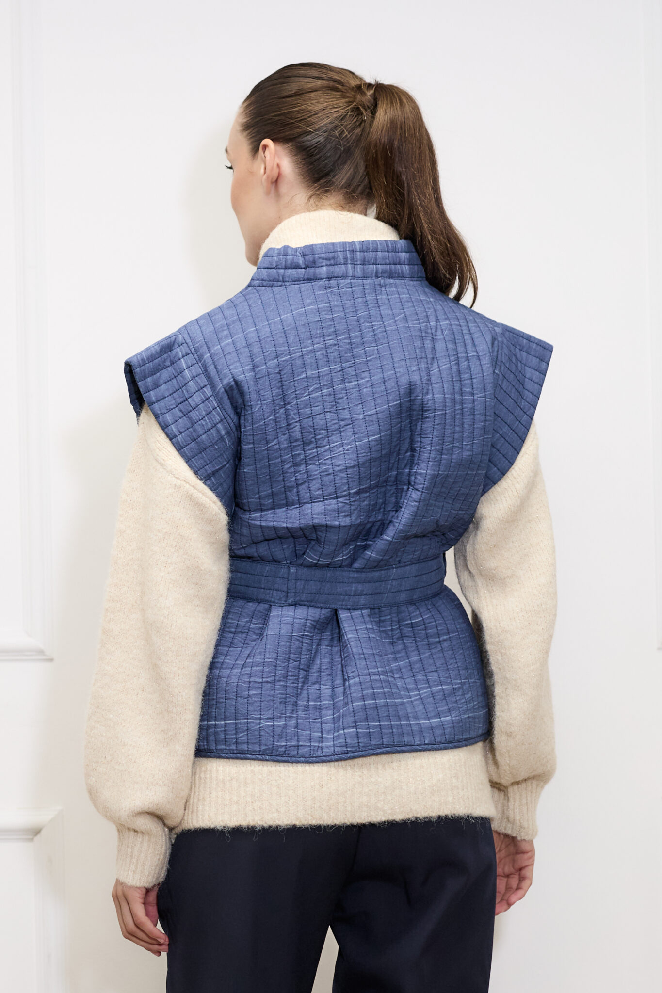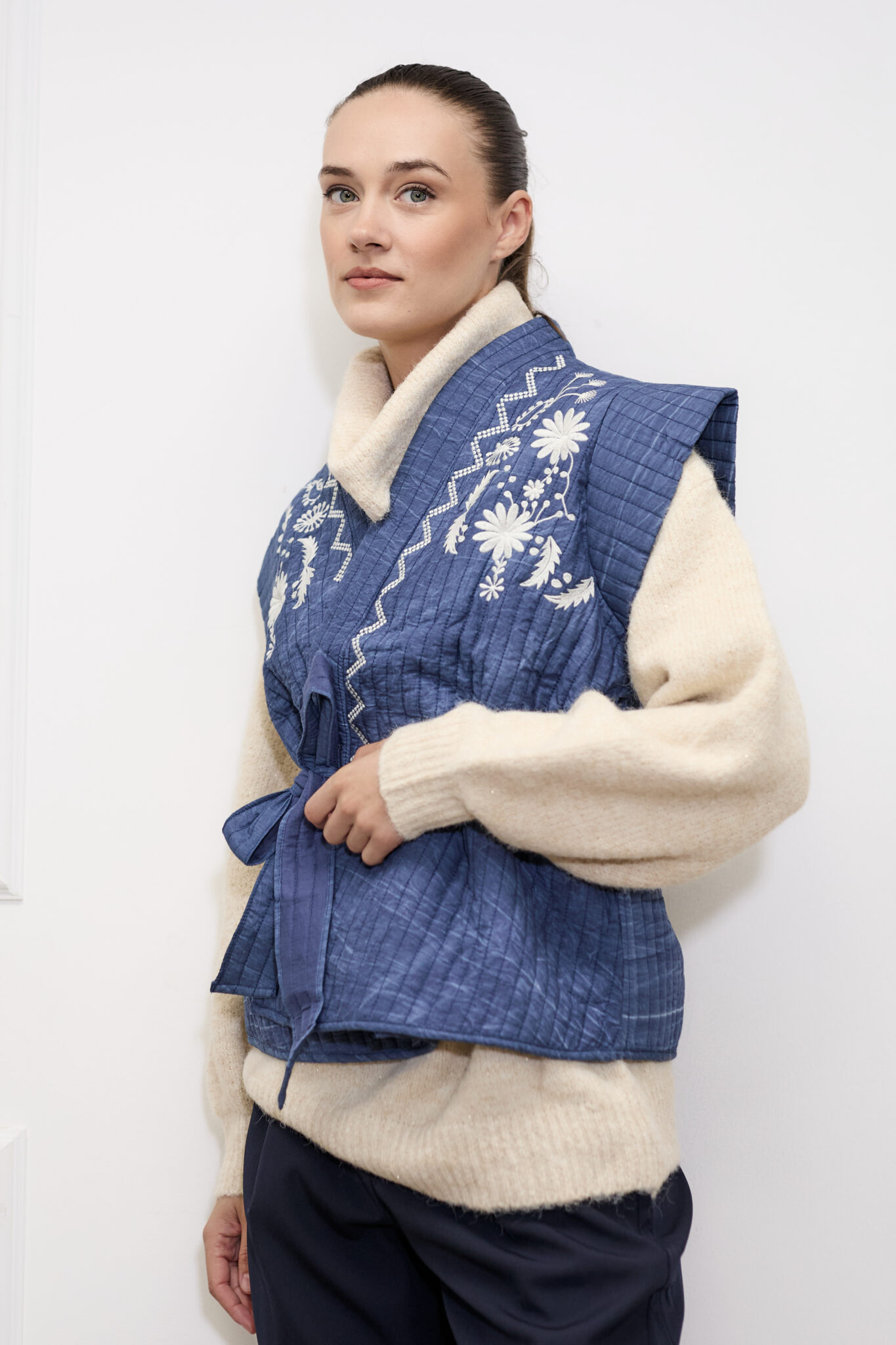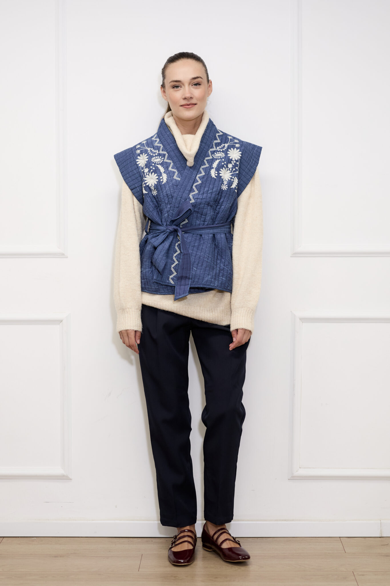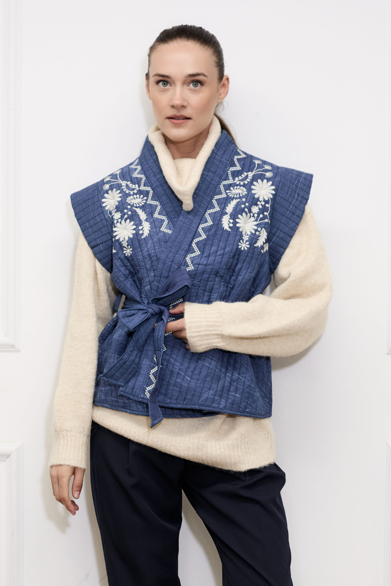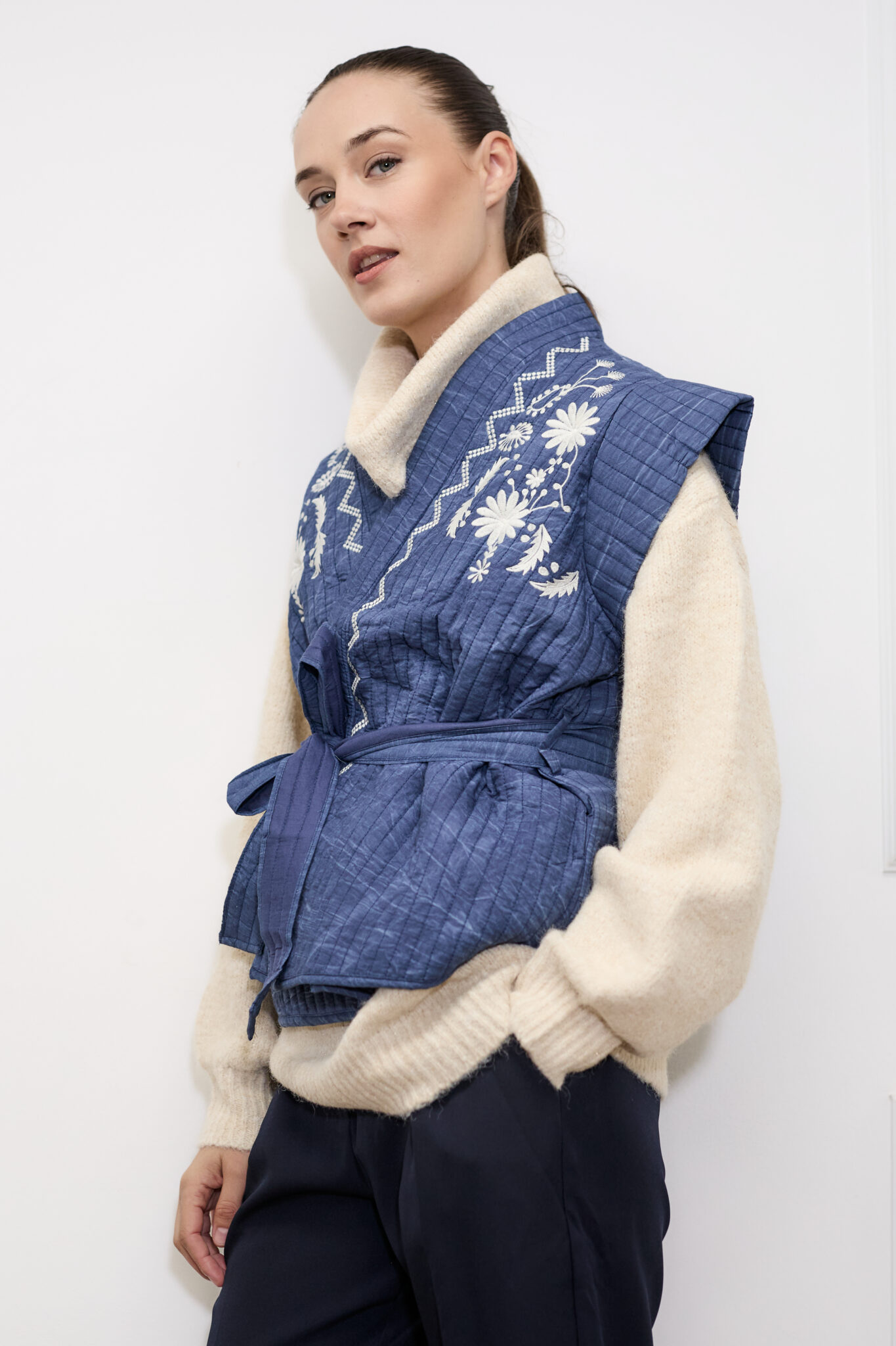 מעיל ווסט עם רקמה, קשירה במותן וכתפיים רחבות.
