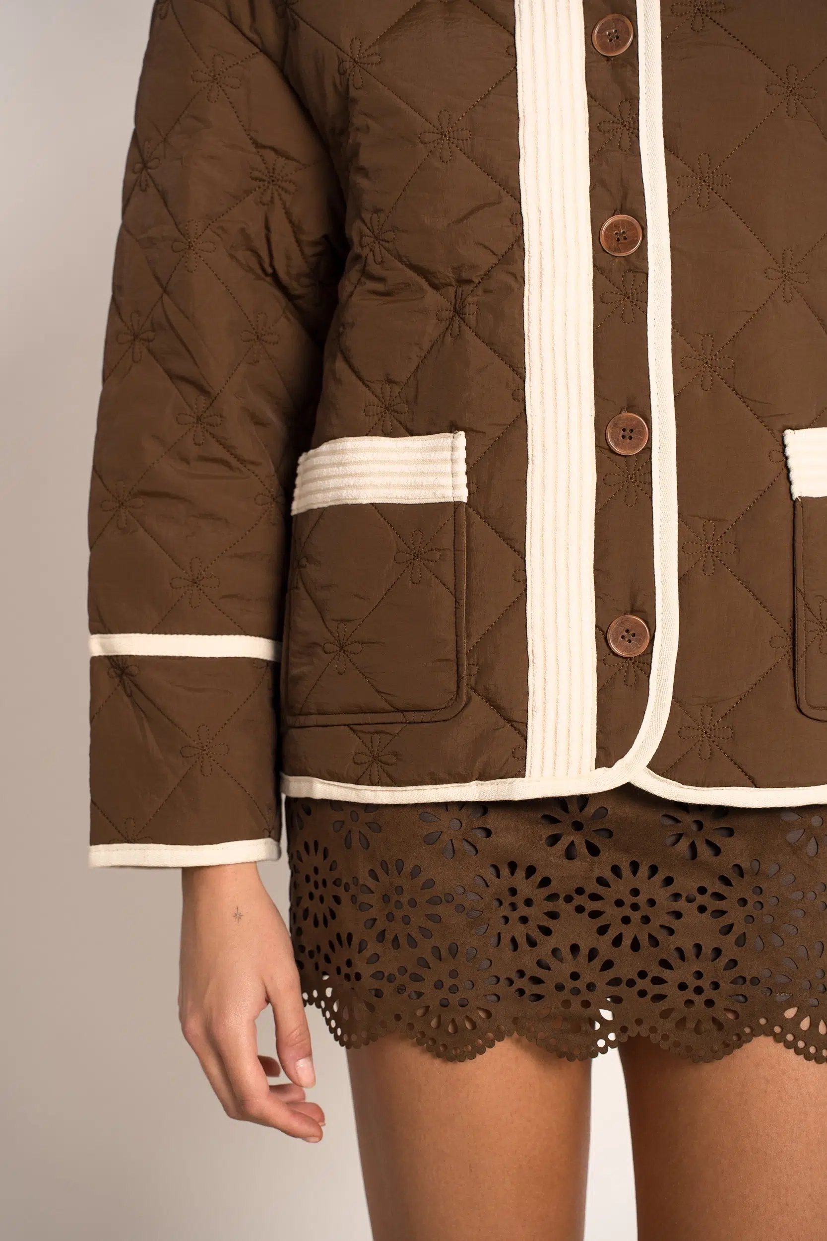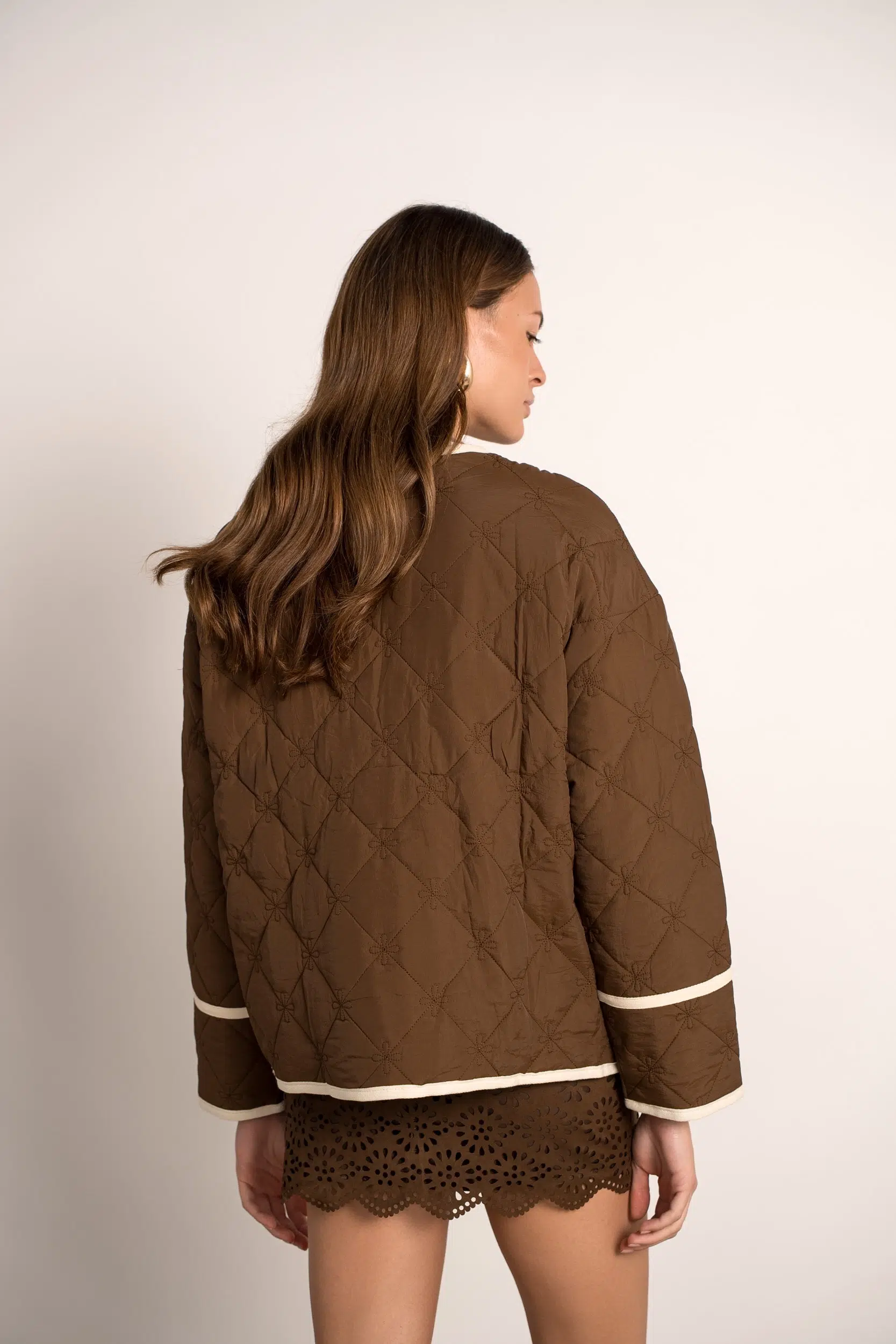 ג׳קט קצר בסגנון על-זמני, עשוי בד מרופד בעל תיפורי מעוינים עדינים היוצרים מרקם עשיר ומסוגנן. הג׳קט מגיע עם פסים בצבע שמנת לאורך הפתח הקדמי, בקצוות השרוולים, בכיסים ובמכפלת