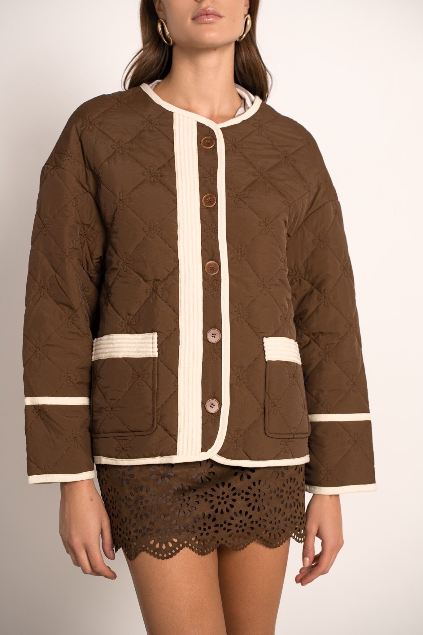 ג׳קט קצר בסגנון על-זמני, עשוי בד מרופד בעל תיפורי מעוינים עדינים היוצרים מרקם עשיר ומסוגנן. הג׳קט מגיע עם פסים בצבע שמנת לאורך הפתח הקדמי, בקצוות השרוולים, בכיסים ובמכפלת