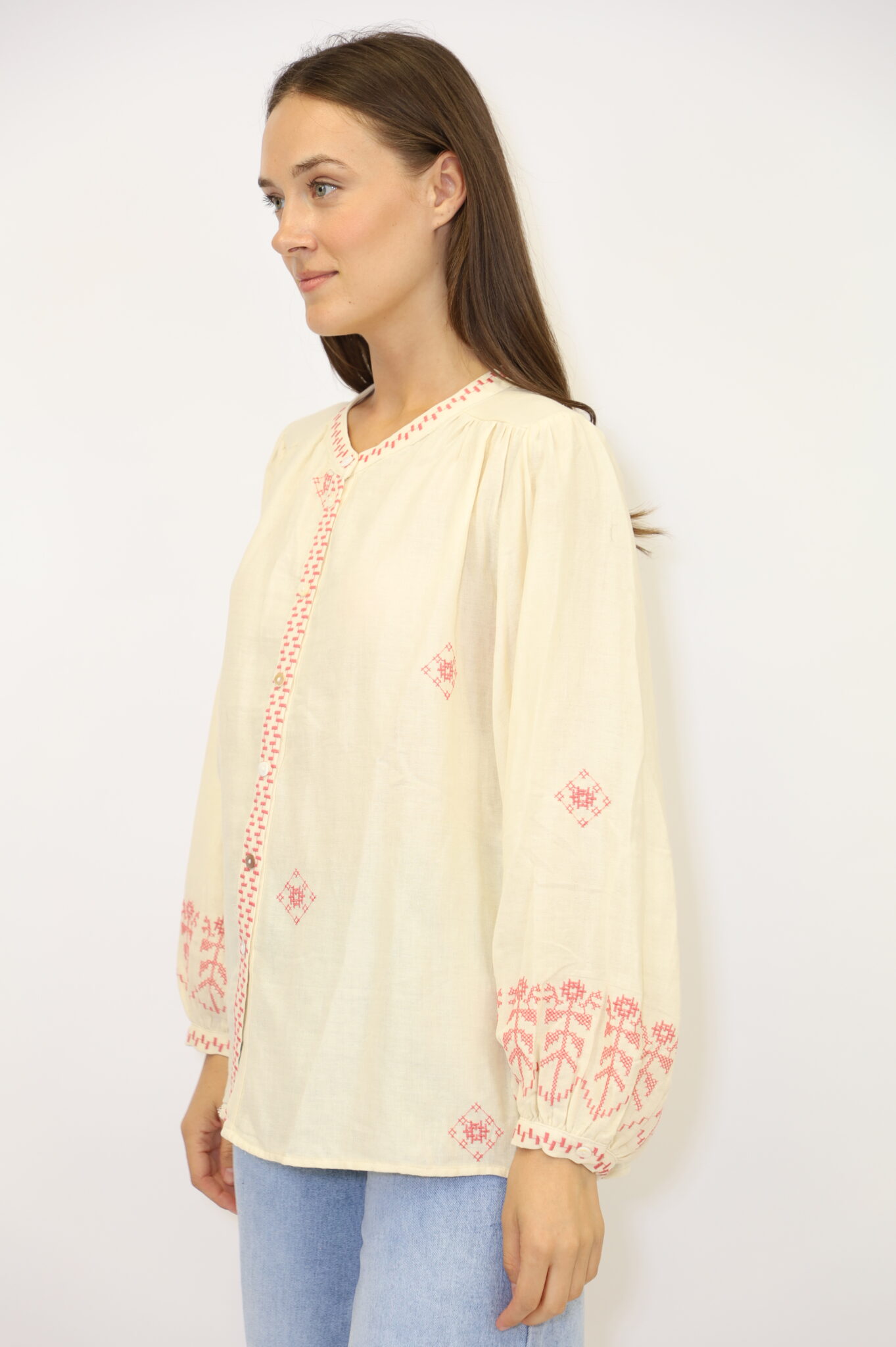 חולצה מבד כותנה אוורירי עם רקמות אתניות מרהיבות ודיטיילים עשירים בשרוולים ובחזית. הגזרה המשוחררת מעניקה תחושת חופש ונינוחות, והעיצוב המיוחד מוסיף טאצ' בוהו-שיק אלגנטי שמתאים לכל עונה