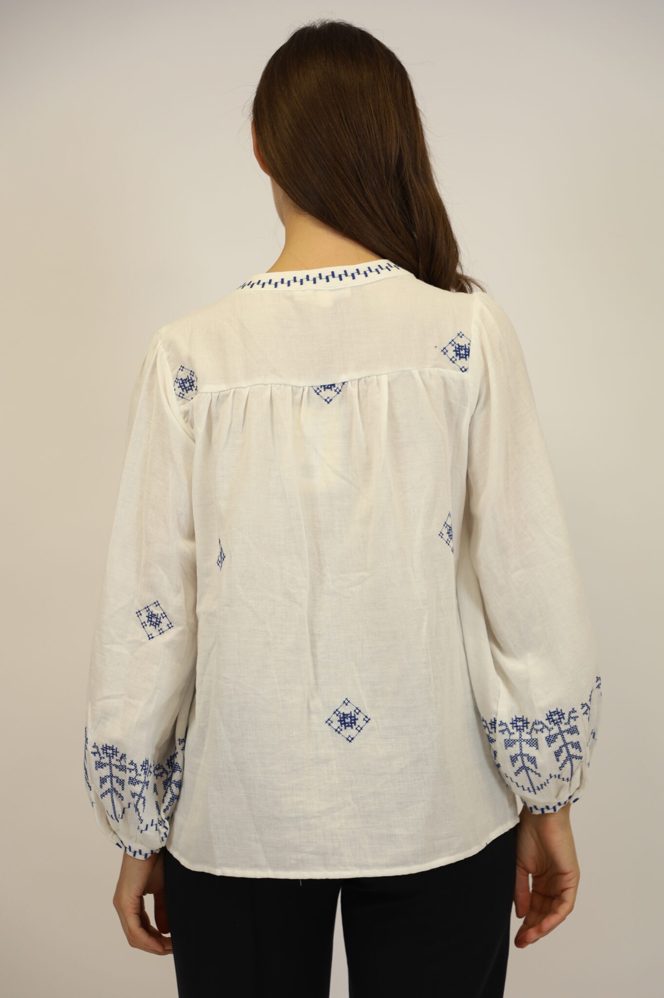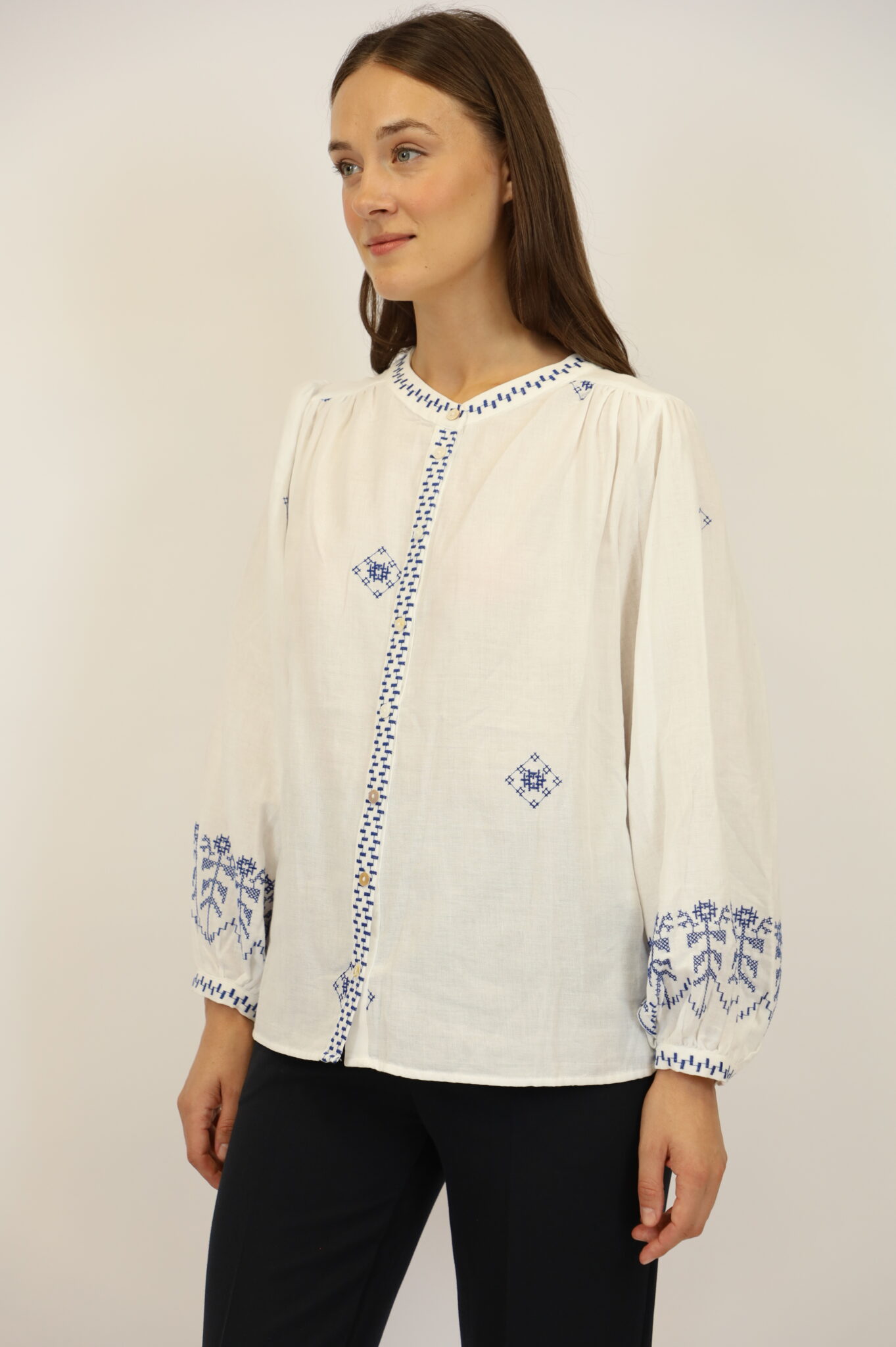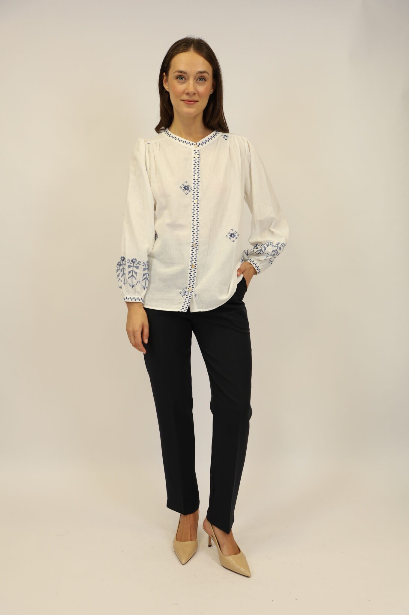חולצה מבד כותנה אוורירי עם רקמות אתניות מרהיבות ודיטיילים עשירים בשרוולים ובחזית. הגזרה המשוחררת מעניקה תחושת חופש ונינוחות, והעיצוב המיוחד מוסיף טאצ' בוהו-שיק אלגנטי שמתאים לכל עונה