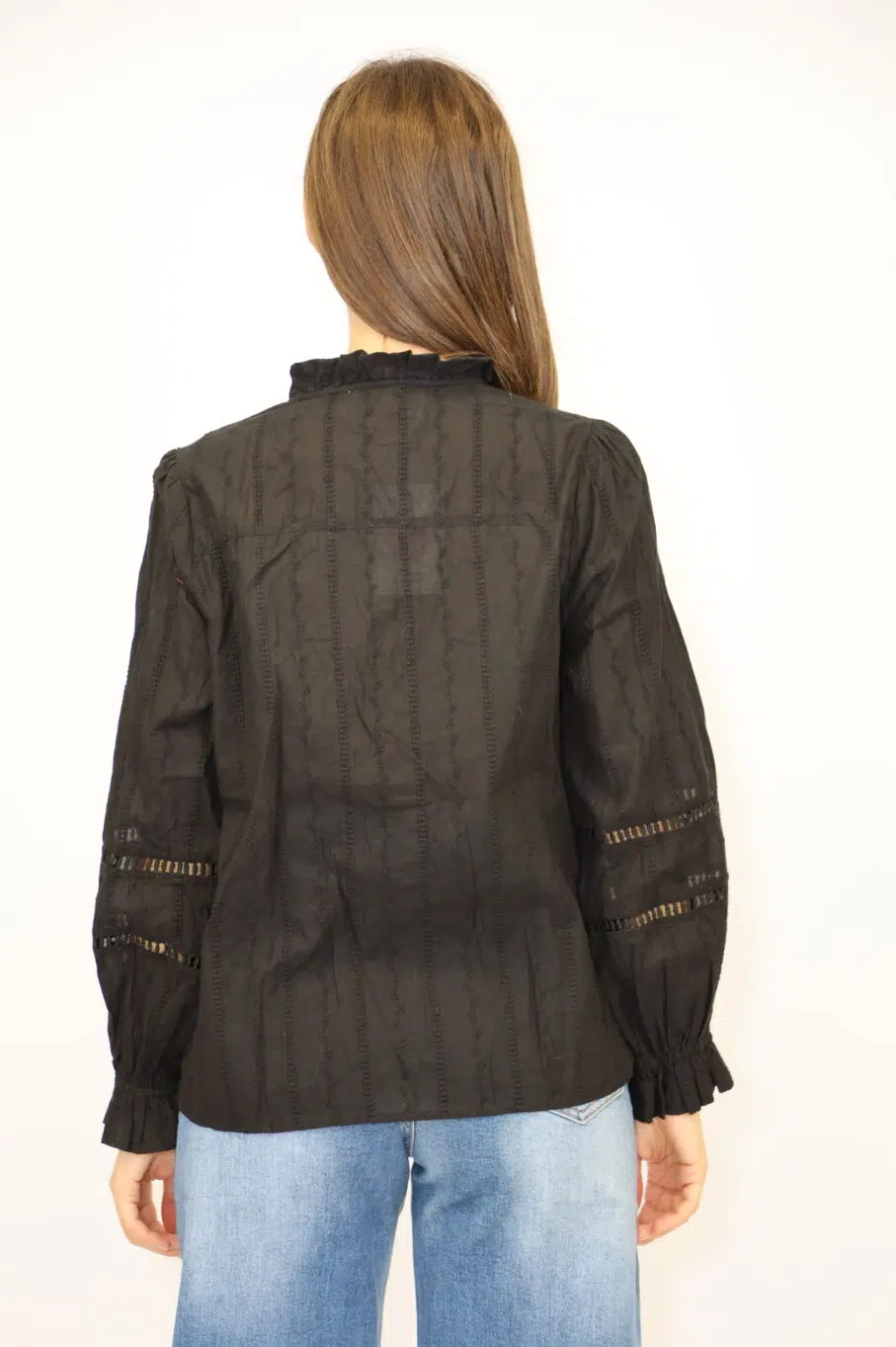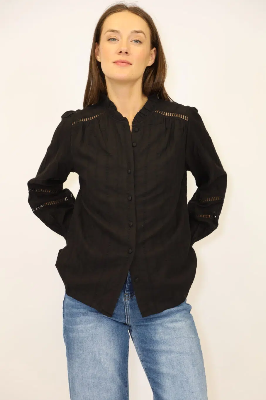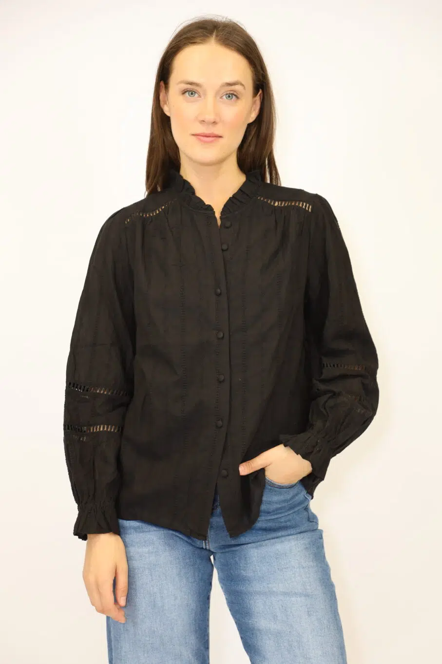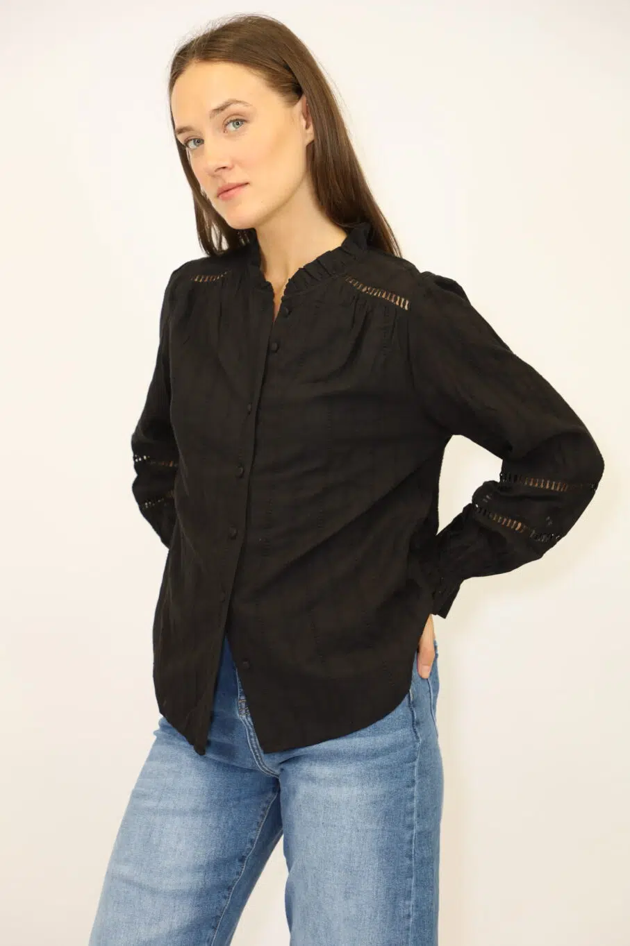 חולצה עשויה בד כותנה קליל עם טקסטורה עדינה, כפתורים מצופים ובגימור צווארון ושרוולים עם פרטים רומנטיים. פריט על-זמני שמביא שילוב של אלגנטיות נקייה וסטייל נינוח לכל לוק