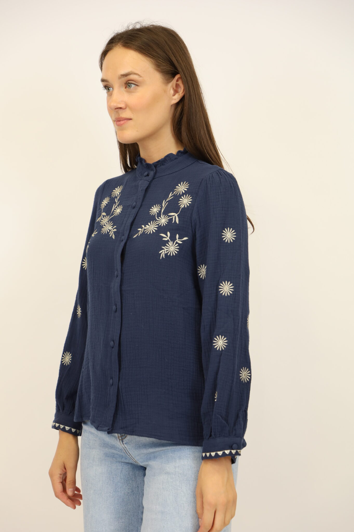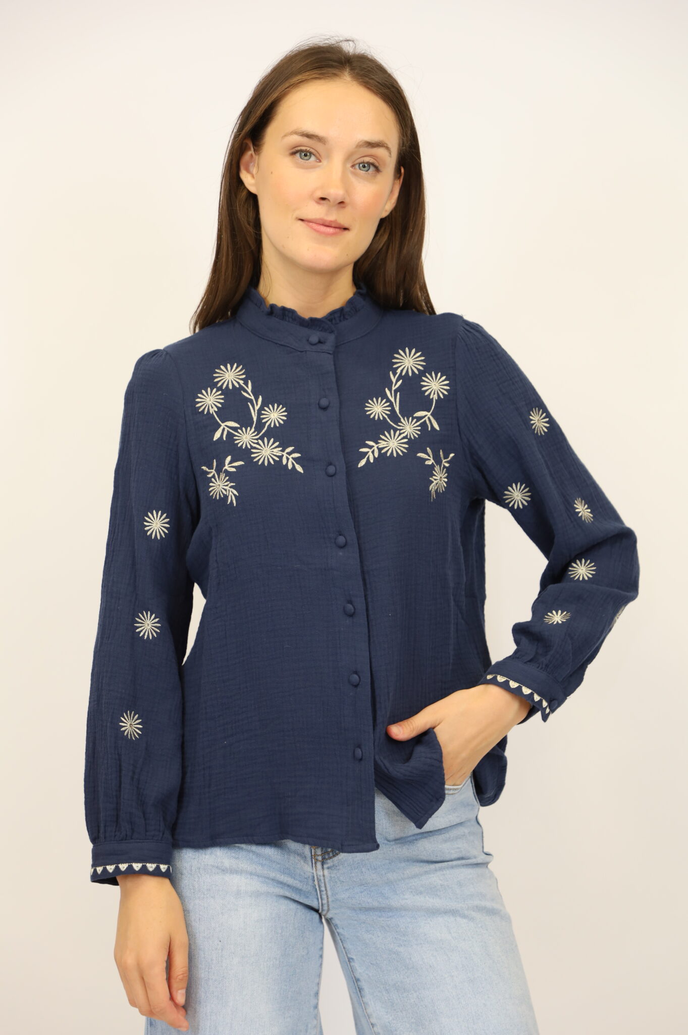 חולצה עשויה כותנה קלילה עם רקמות פרחוניות בשחור שמוסיפות נגיעה בוהו-שיק אלגנטית. הכפתורים העדינים והגימור בצווארון ובשרוולים מעניקים לה מראה נשי, נקי ומלא סטייל על-זמני.