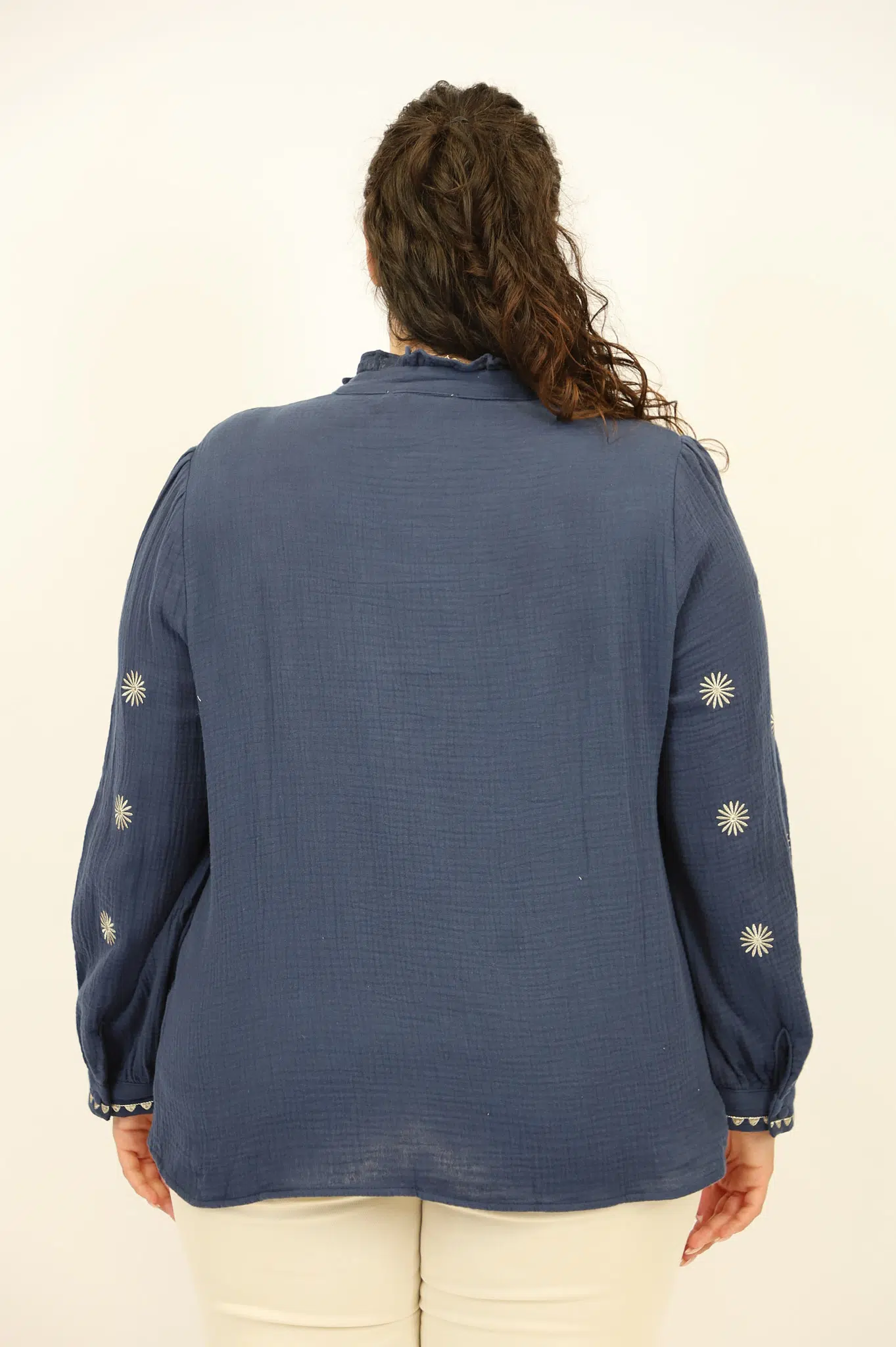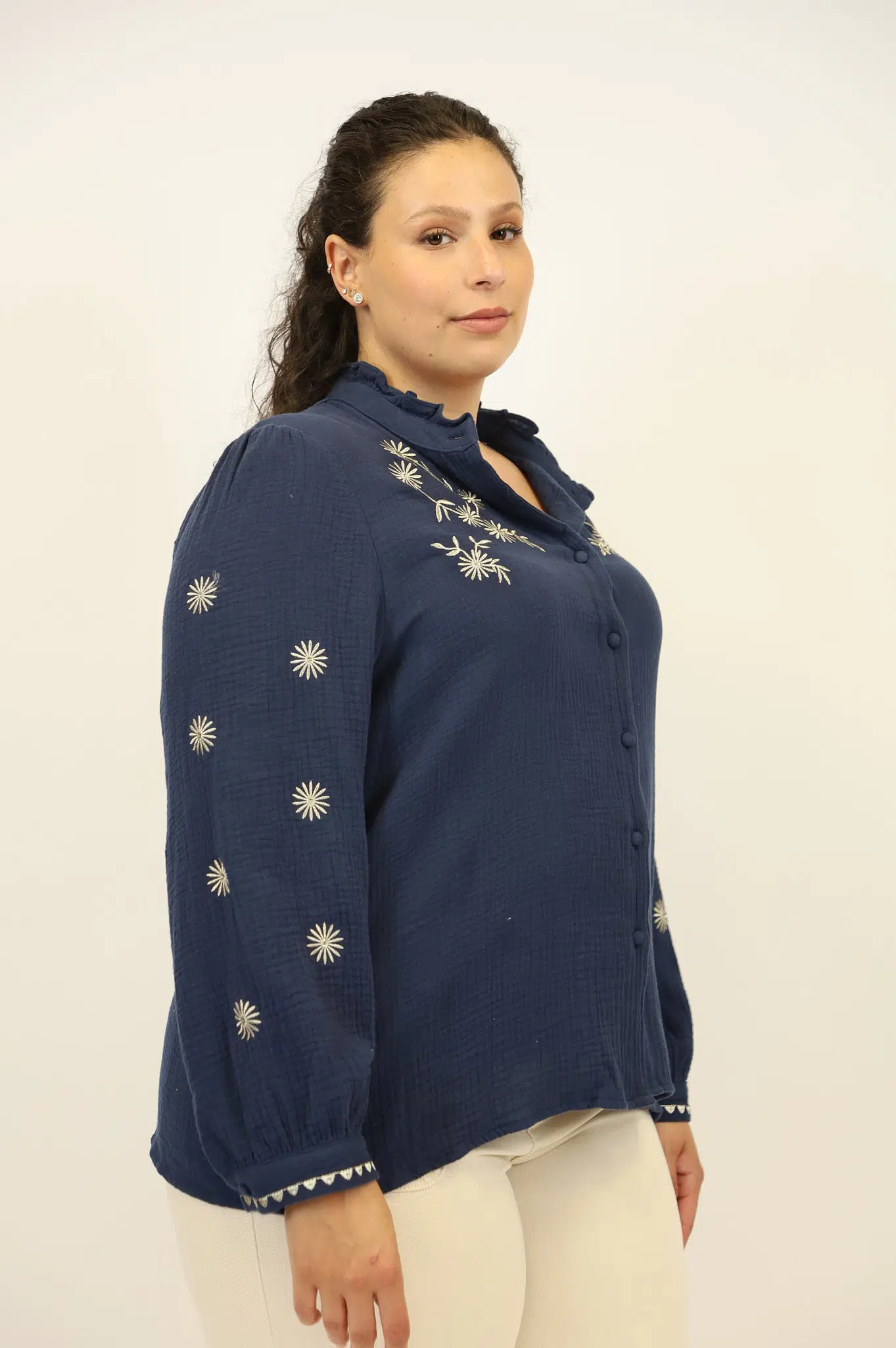 חולצה עשויה כותנה קלילה עם רקמות פרחוניות בשחור שמוסיפות נגיעה בוהו-שיק אלגנטית. הכפתורים העדינים והגימור בצווארון ובשרוולים מעניקים לה מראה נשי, נקי ומלא סטייל על-זמני.