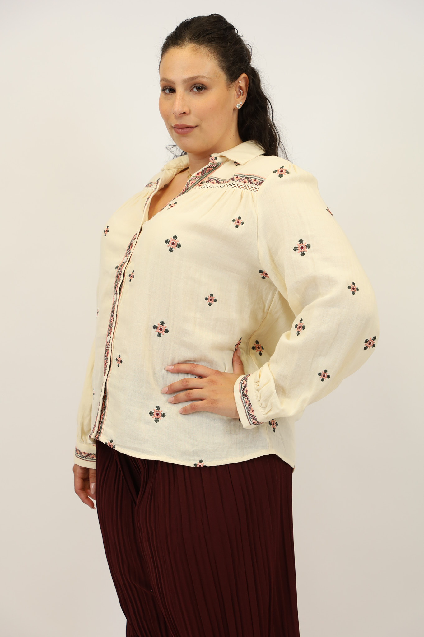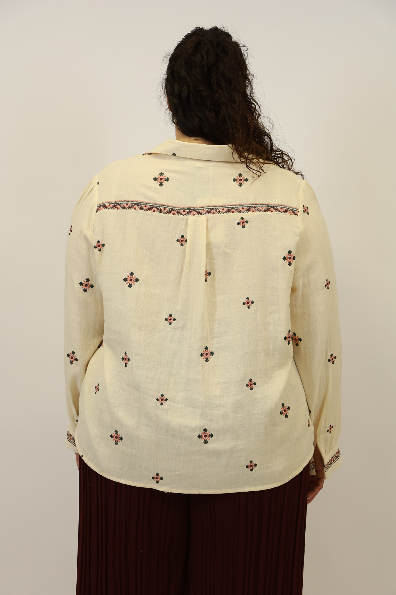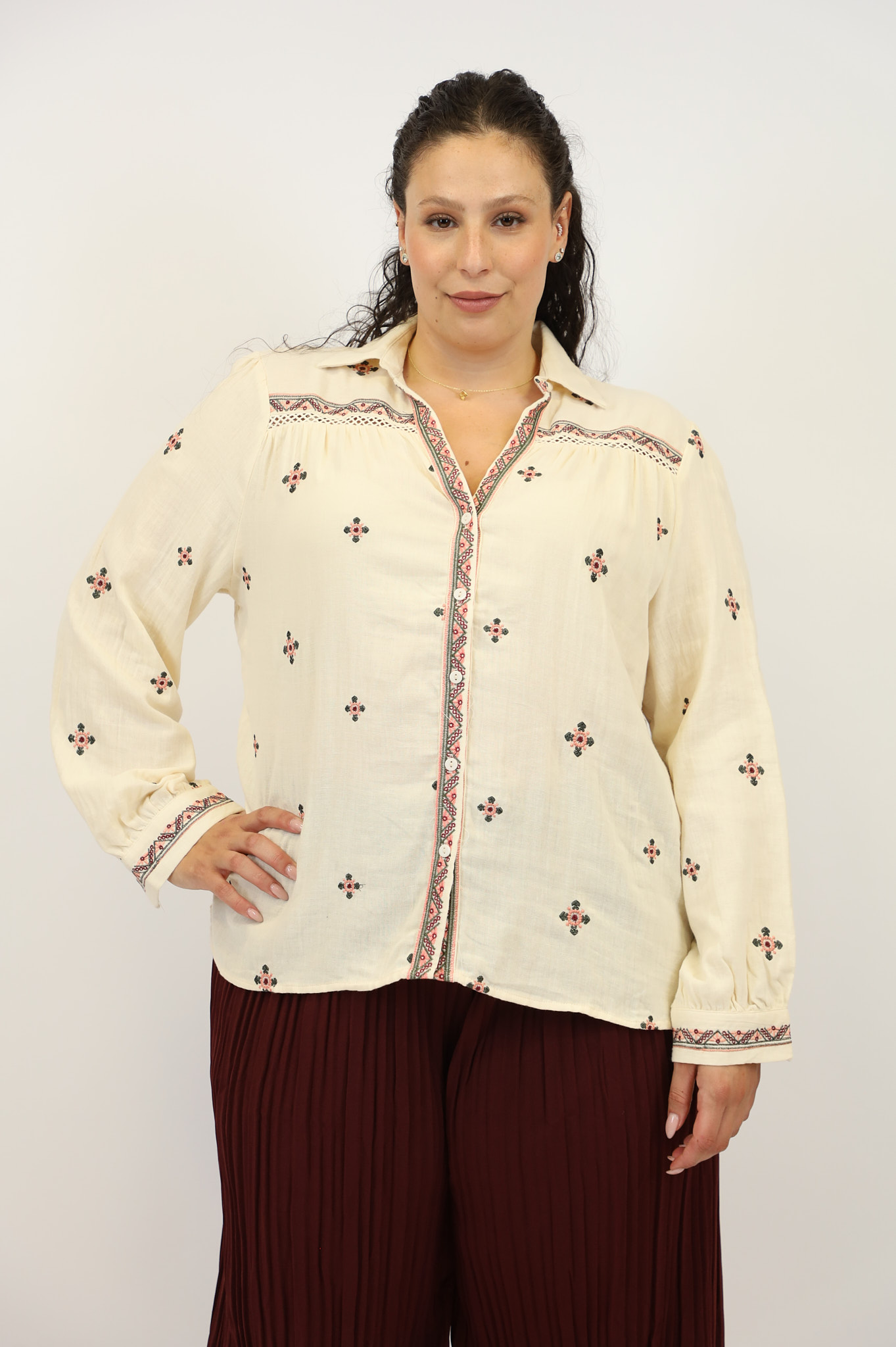 חולצת כותנה רקומה בגוון טבעי, עם דוגמאות אתניות עדינות לאורך החזית והשרוולים. פריט בוהו-שיק קליל שמכניס צבע וקסם לכל לוק – מושלם ליומיום עם ג’ינס או לערב עם חצאית זורמת