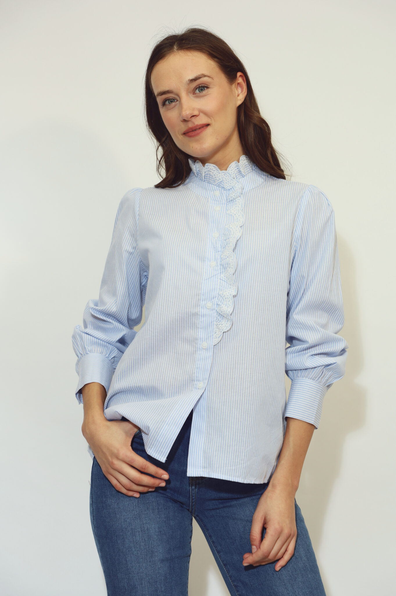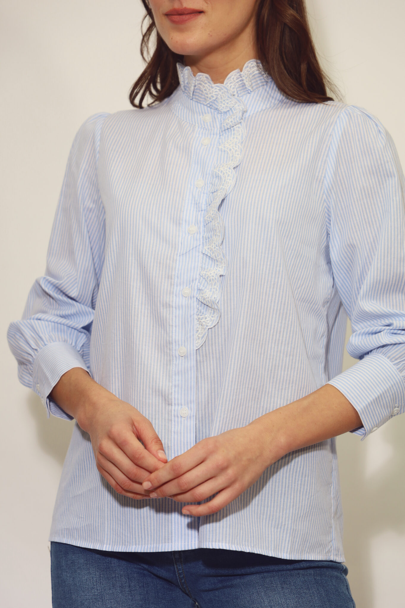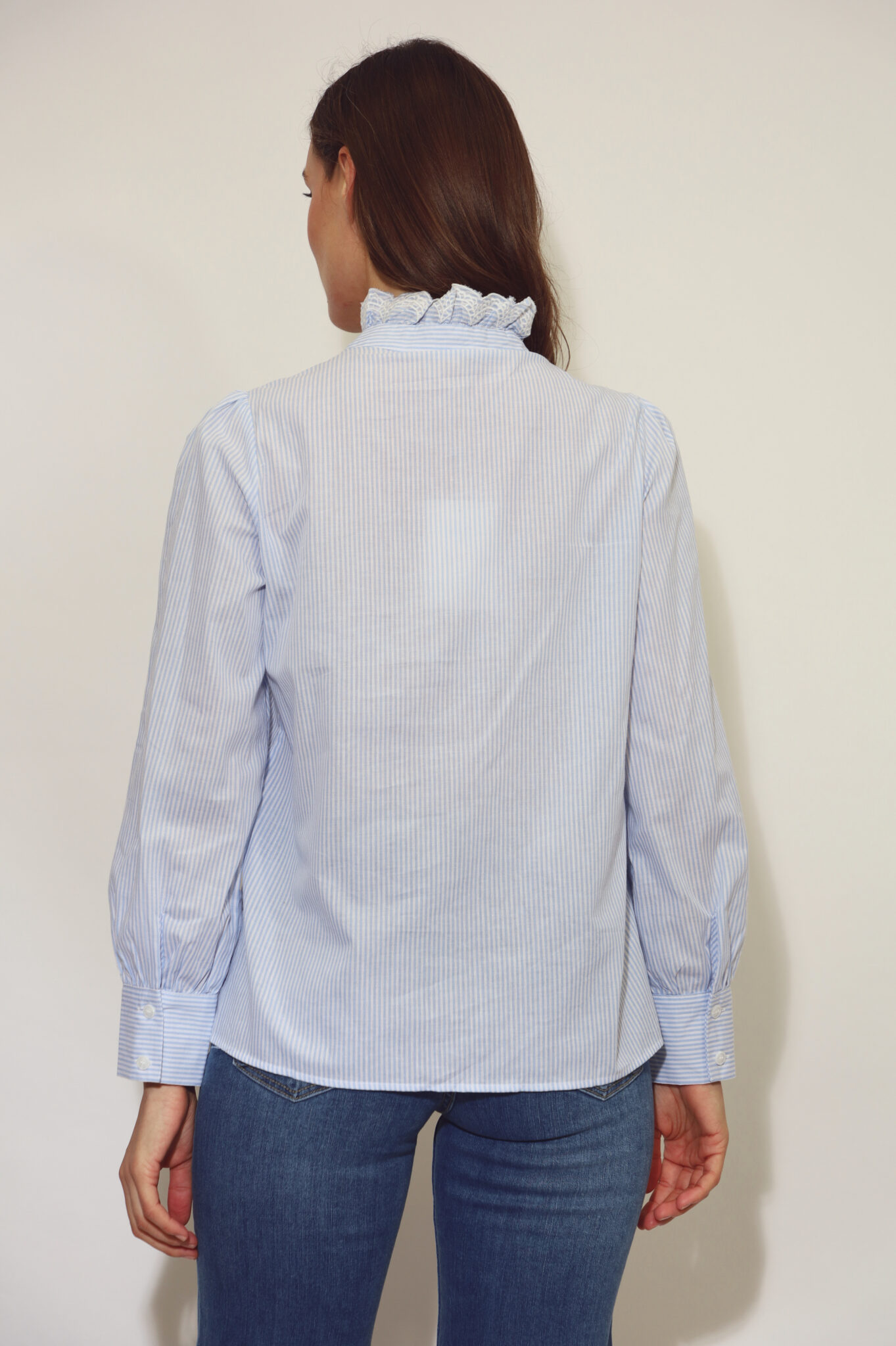 חולצת פסים מכופתרת עם דיטייל מלמלה מהכפתורים ועד לצווארון גבוה.