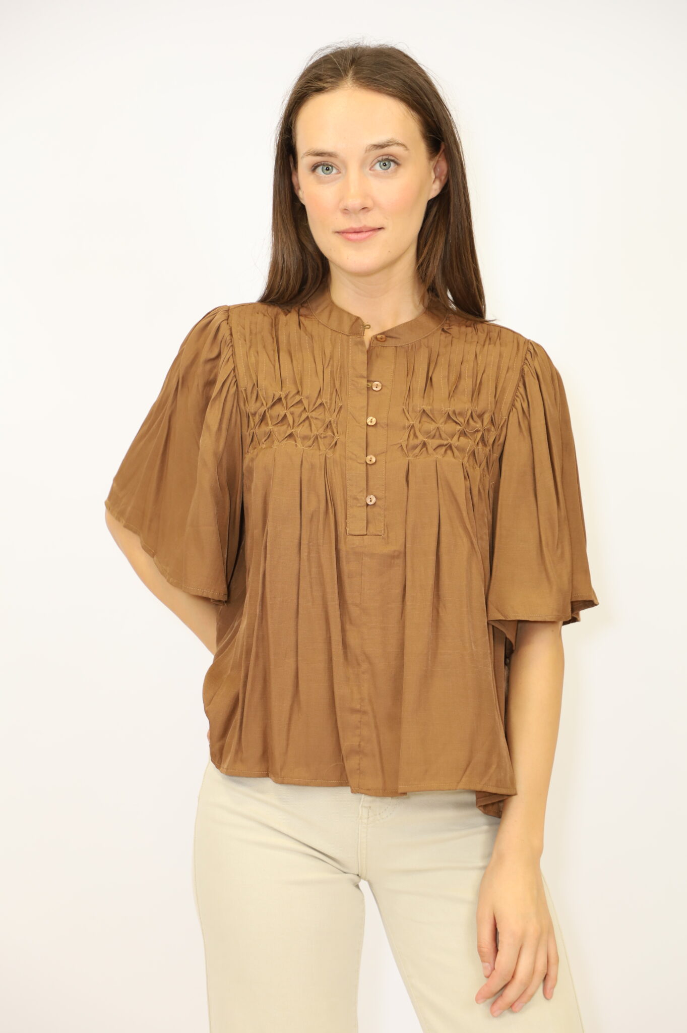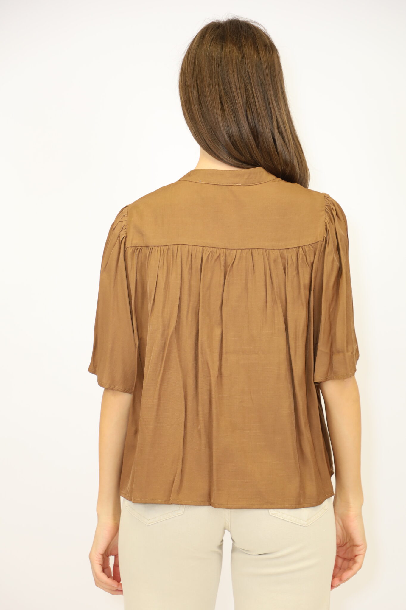 בעלת כפתורים בחזית וצווארון עגול סגור, עם שרוולים רחבים באורך מרפק לנוחות מקסימלית.