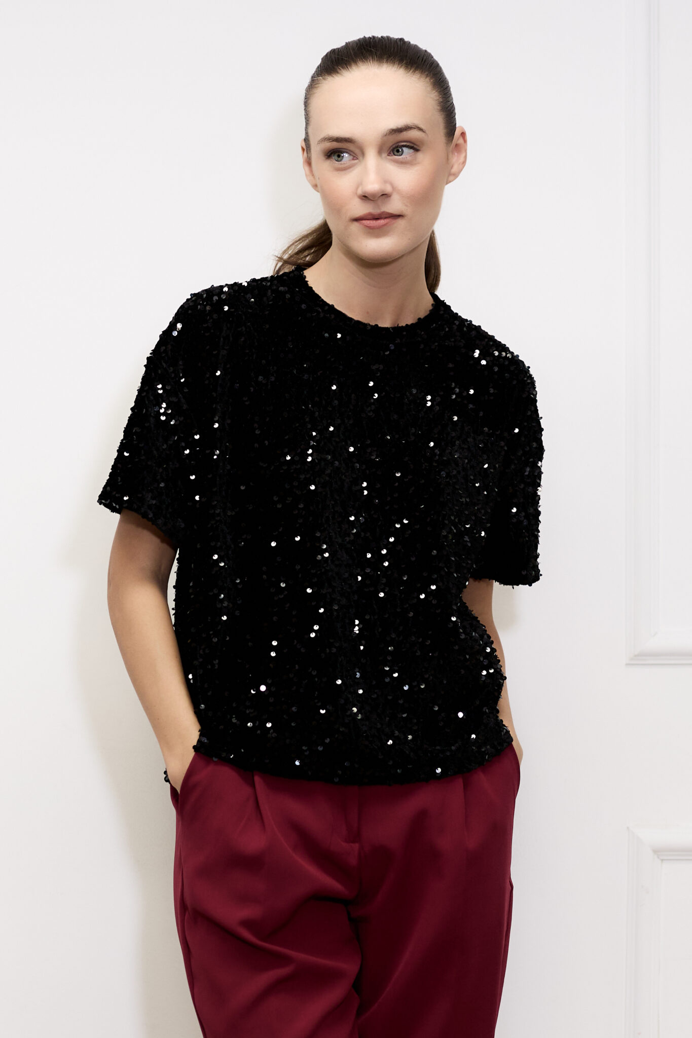 הזמן שלך לזהור! חולצת פייטים בגזרה ישרה, שרוולים קצרים וצווארון עגול.