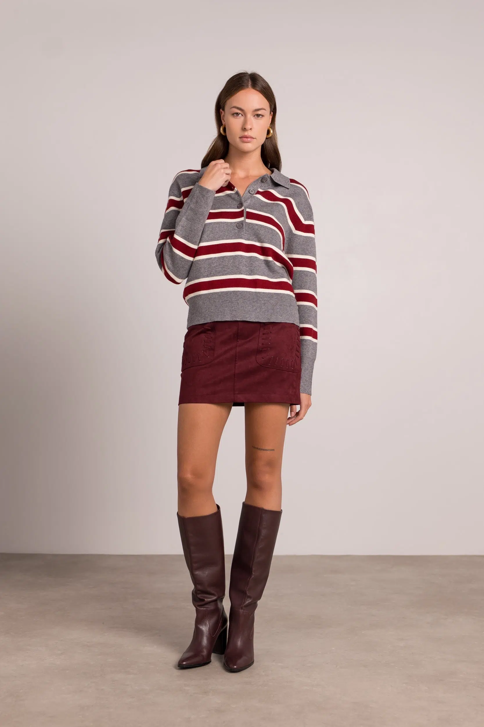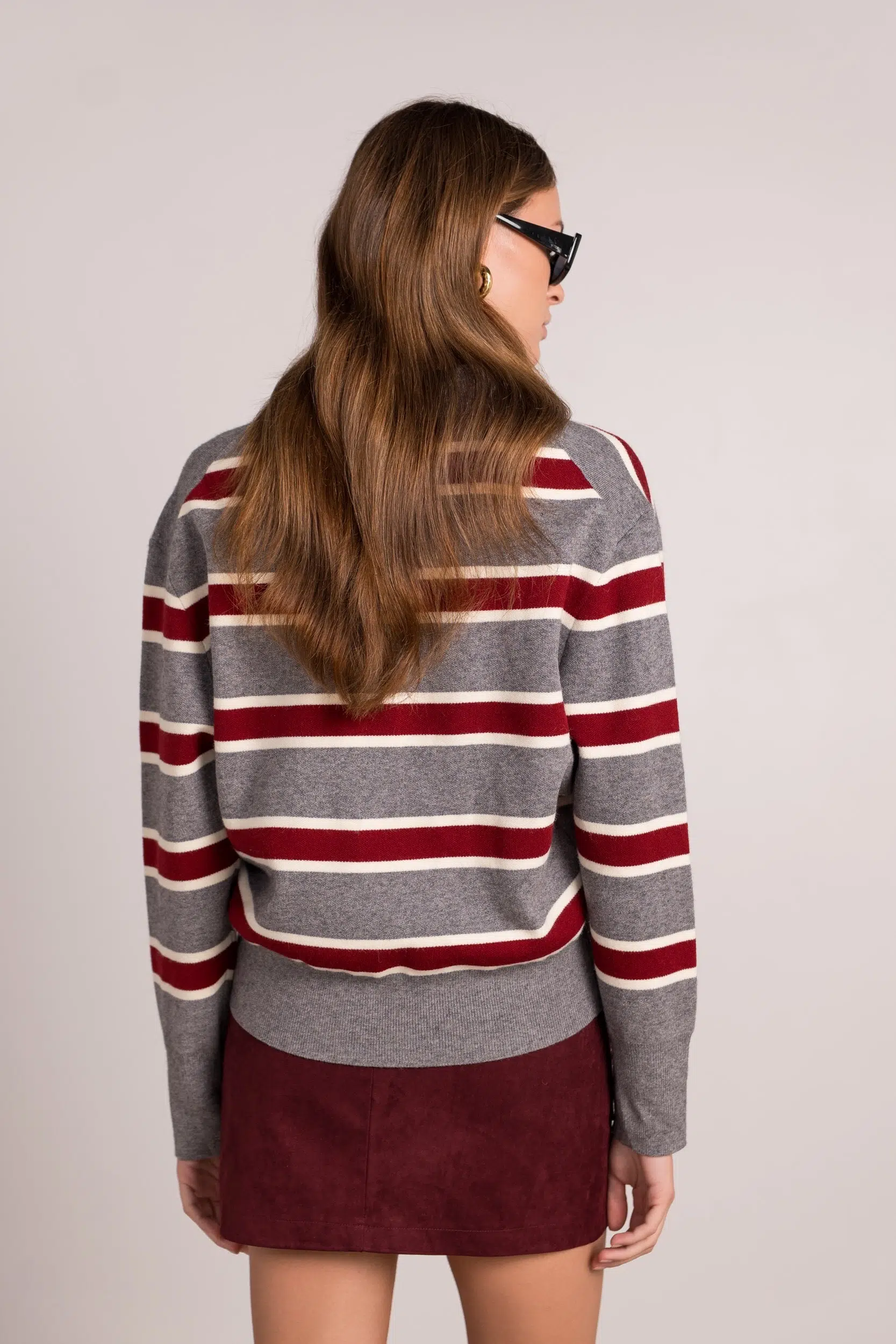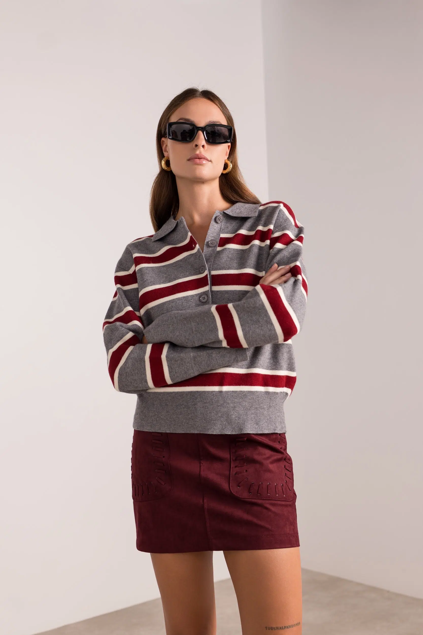 סריג פולו נעים למגע בגזרה רפויה, עם פסים רחבים בצבעי אפור ובורדו ופתיחת כפתורים בחזית. מושלם למראה יומיומי אלגנטי ונוח