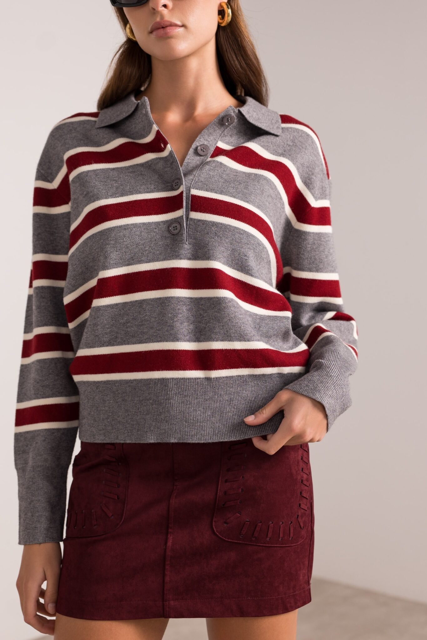 סריג פולו נעים למגע בגזרה רפויה, עם פסים רחבים בצבעי אפור ובורדו ופתיחת כפתורים בחזית. מושלם למראה יומיומי אלגנטי ונוח