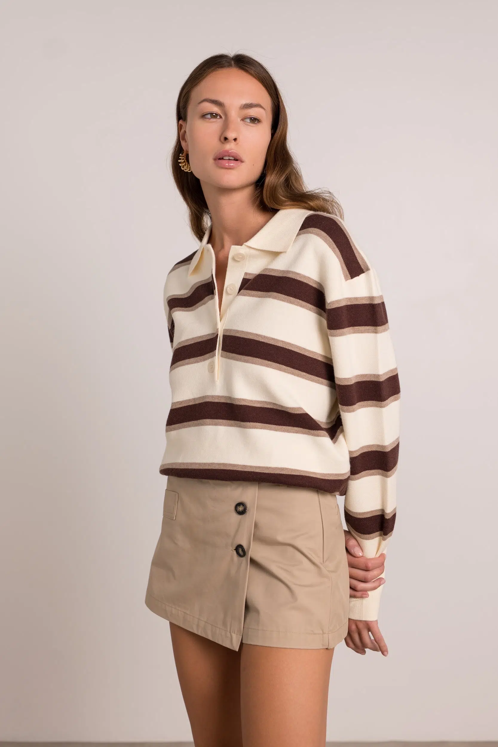 סריג פולו נעים למגע בגזרה רפויה, עם פסים רחבים בצבעי שמנת וחום שוקולד ופתיחת כפתורים בחזית. מושלם למראה יומיומי אלגנטי ונוח