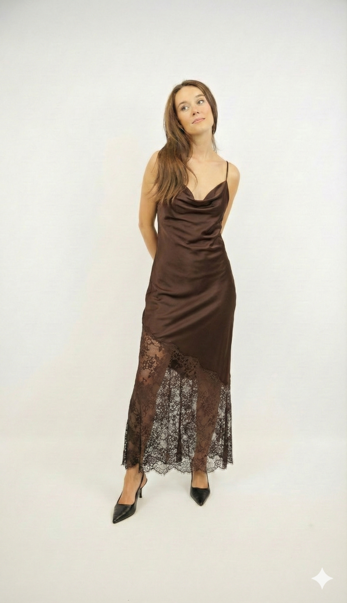 • שמלה סאטן שילוב תחרה Lily | שוקו – IV-PR7877-CHOCO