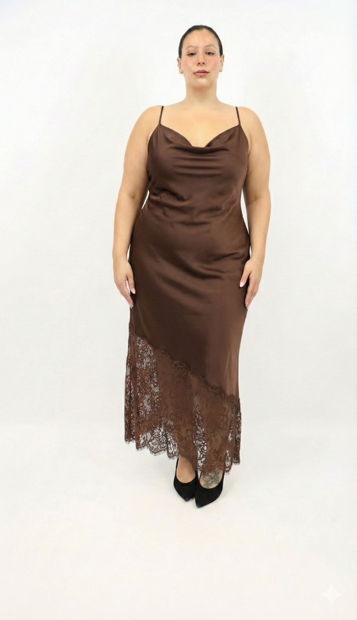 שמלה סאטן שילוב תחרה Lily | שוקו – IV-AC7877-CHOCO